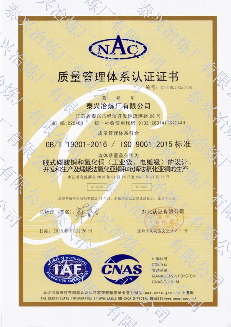 泰興冶煉廠有限公司(原泰興冶煉廠),始建于20世紀70年代初,現位于江蘇省泰興經濟開發區。歷經40年的創新驅動、穩健發展,已成長為一家專業生產堿式碳酸銅、高純電鍍氧化銅、氧化亞銅、氧化銅、無水硫酸銅、海綿銅粉及副產品聚氯化鋁(凈水劑)等系列無機鹽產品及處置不含氨的氯化銅蝕刻液(HW22)15000噸/年的“國家高新技術企業”和地方性骨干企業。公司總占地面積3.7萬平方米,建筑面積4萬平方米,注冊資本2088萬元,固定資產1.2億元,年產值約7億元。